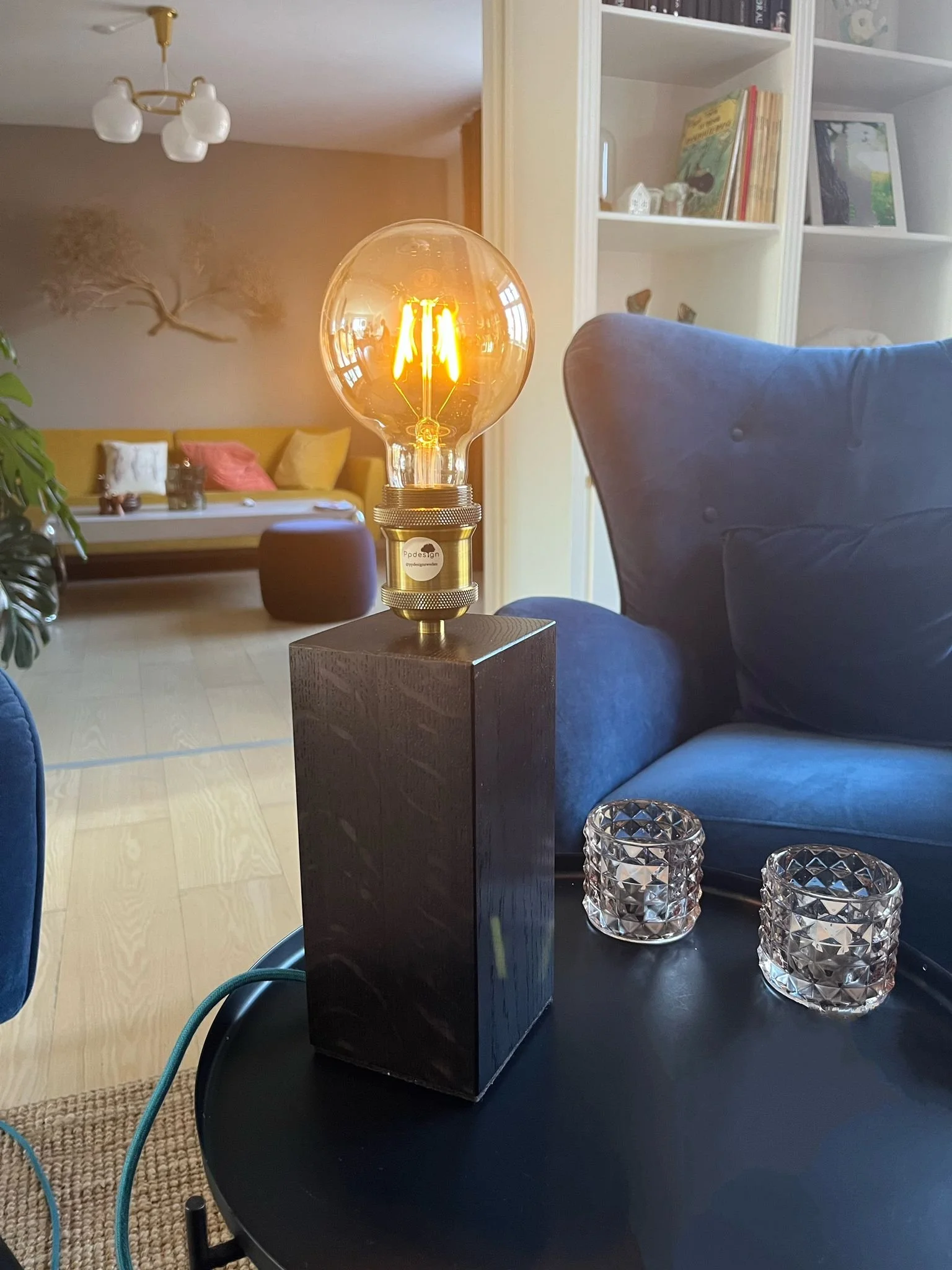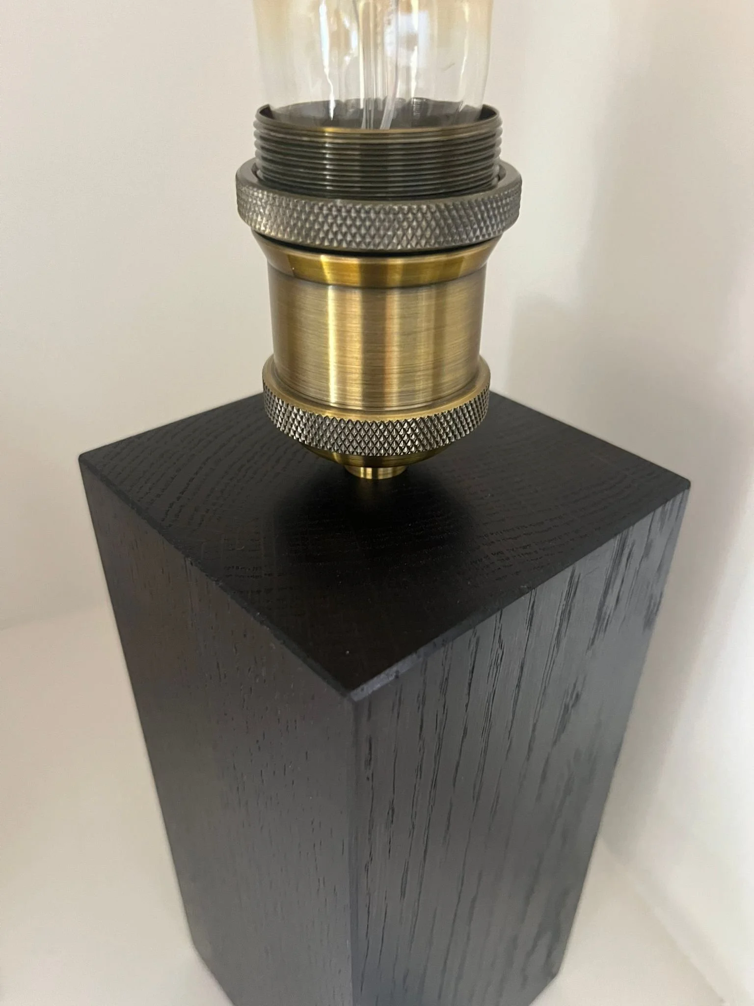 Svartbetsad Lampa i ek med blå sladd och lamphållare i mässing. Ljuskälla medföljer ej.